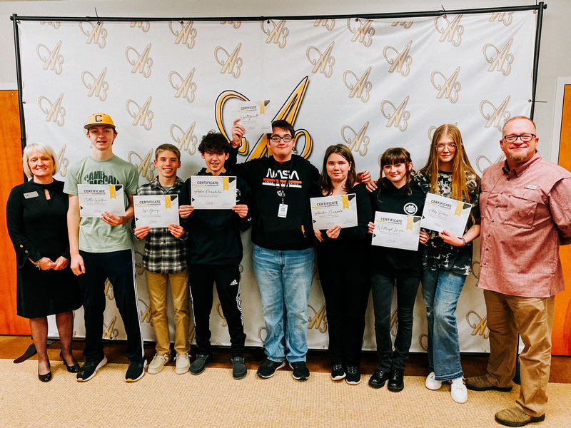 From Right: Superintendent Hipp, Colton Walker, Luke Gray, Asher Pamphilon, Wyatt Garrett, Amelia Ciempola, Willough Larsen, Abby Helms, Board Charman Danny Owens. Not Pictured: Matthew Alessandrini.