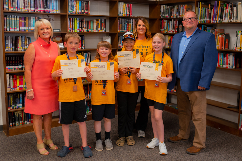 The Flat Rock Elementary Furious Flingers VEX Robotics Team recently qualified for and competed in the world VEX competition in Dallas, Texas. Students Zacch Whitaker, Khloe OโBarr, Jack Gray, and Parker Jimenez, and advisors Lisa Bradford and Casey Beckum were commended at this month's board meeting for their success! Congratulations!